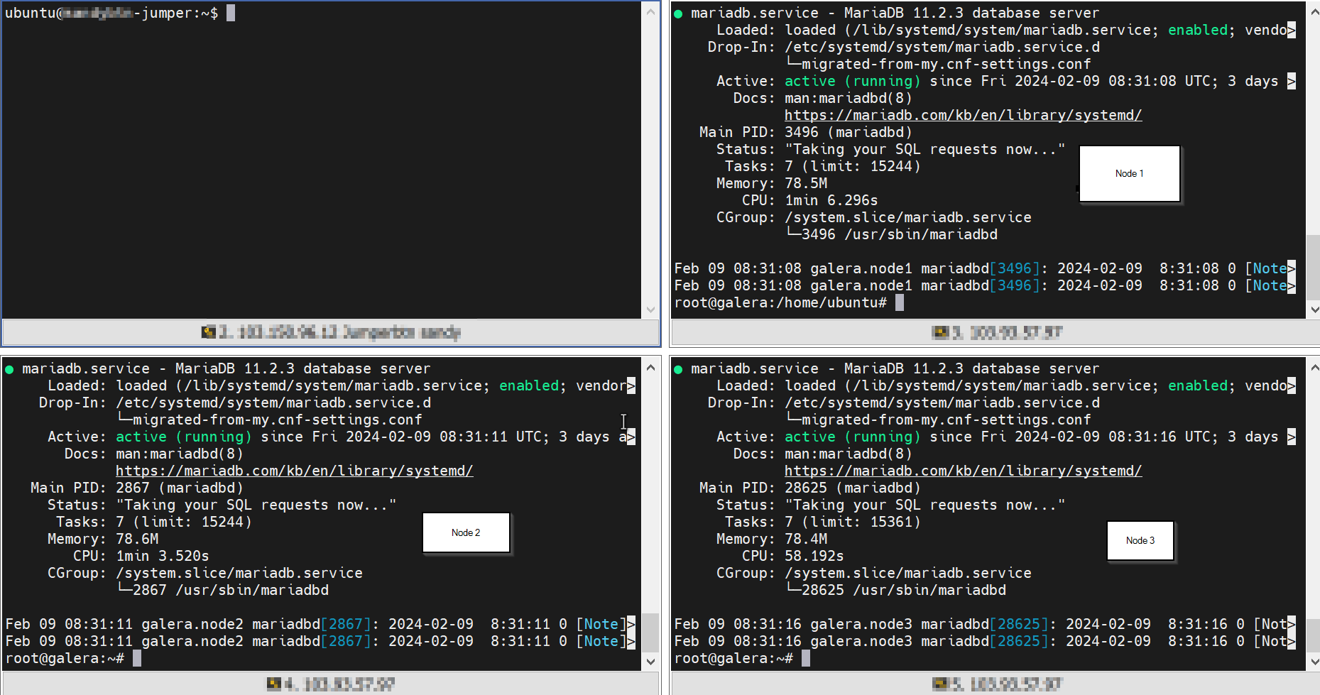 MariaDB installation is done on all three nodes (node1, 2 and 3)
