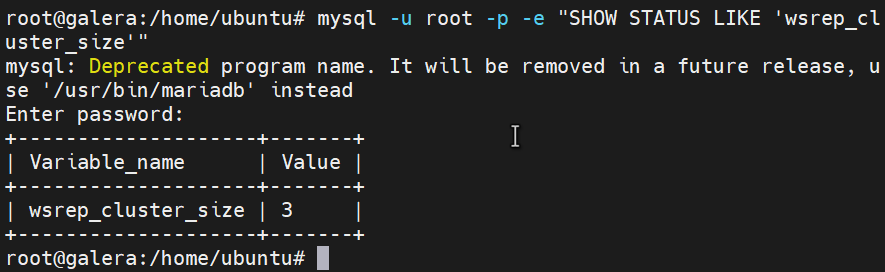 mysql -u root -p -e "SHOW STATUS LIKE 'wsrep_cluster_size'"