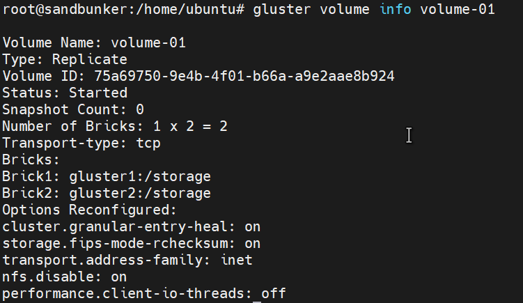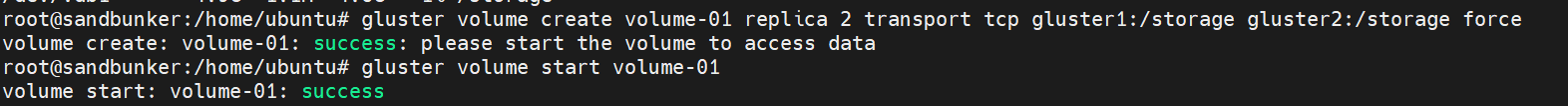 gluster volume create volume-01 replica 2 transport tcp gluster1:/storage gluster2:/storage force