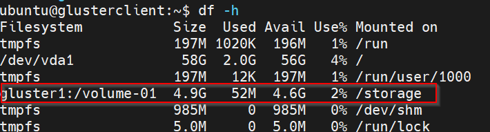 mount -t glusterfs gluster1:/volume-01 /storage