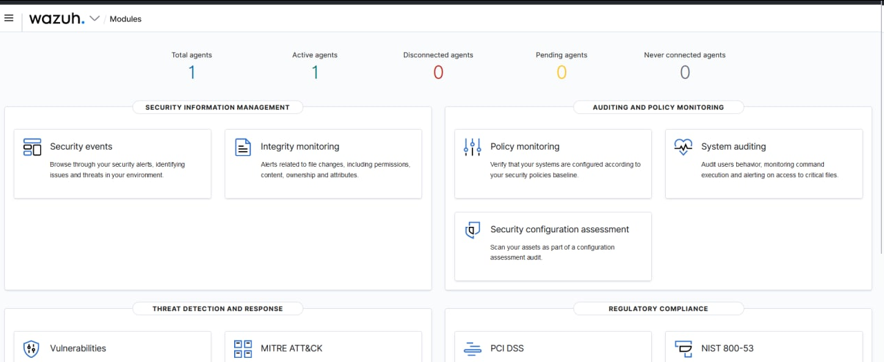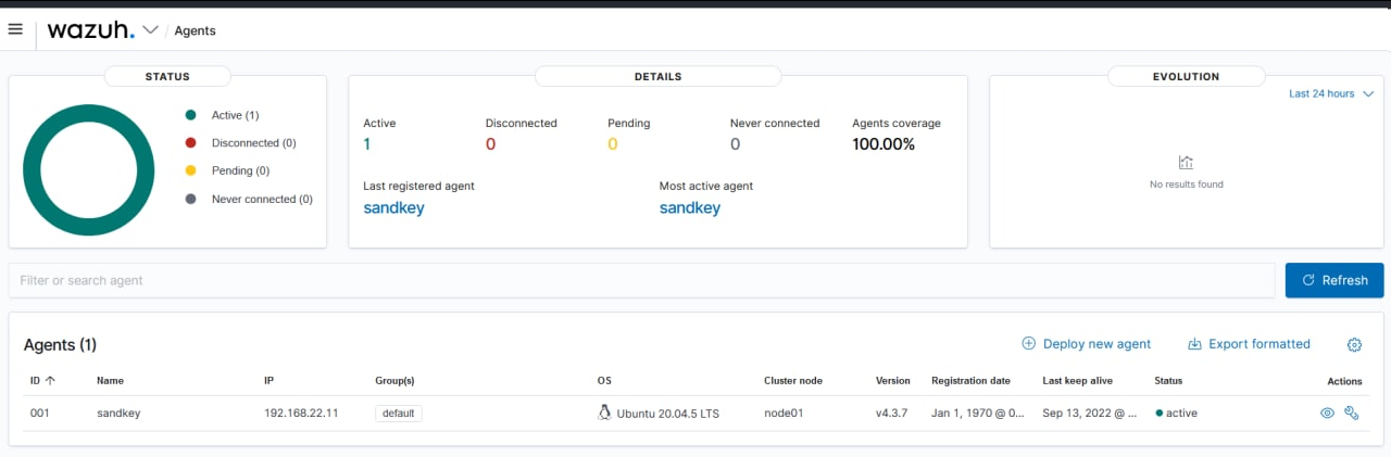 Setelah itu kembali ke dashboard wazuh, dan refresh, hasilnya agent sudah berhasil ditambahkan