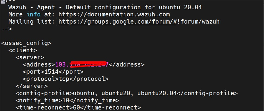 Edit file nano /var/ossec/etc/ossec.conf pastikan address diganti menjadi IP_Server_Wazuh