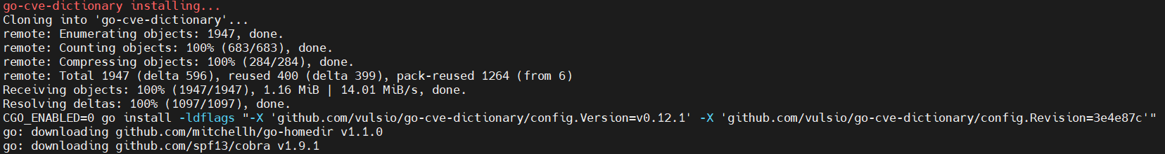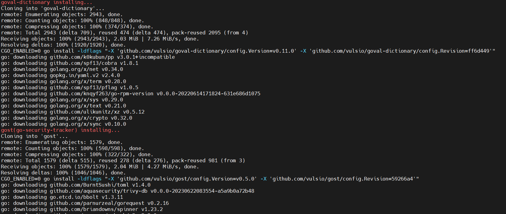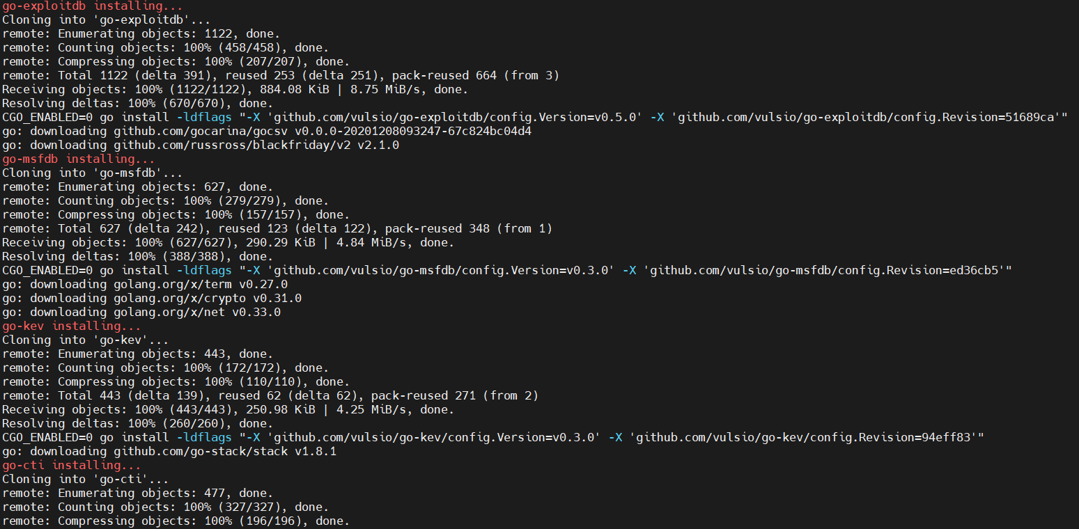 once the the script running, it will install version of golang and then compile and install multiple tools such go-cti, go-cve-dcitionary, go-exploitdb, go-msfdb, goval-dictionary, go-kev and gost