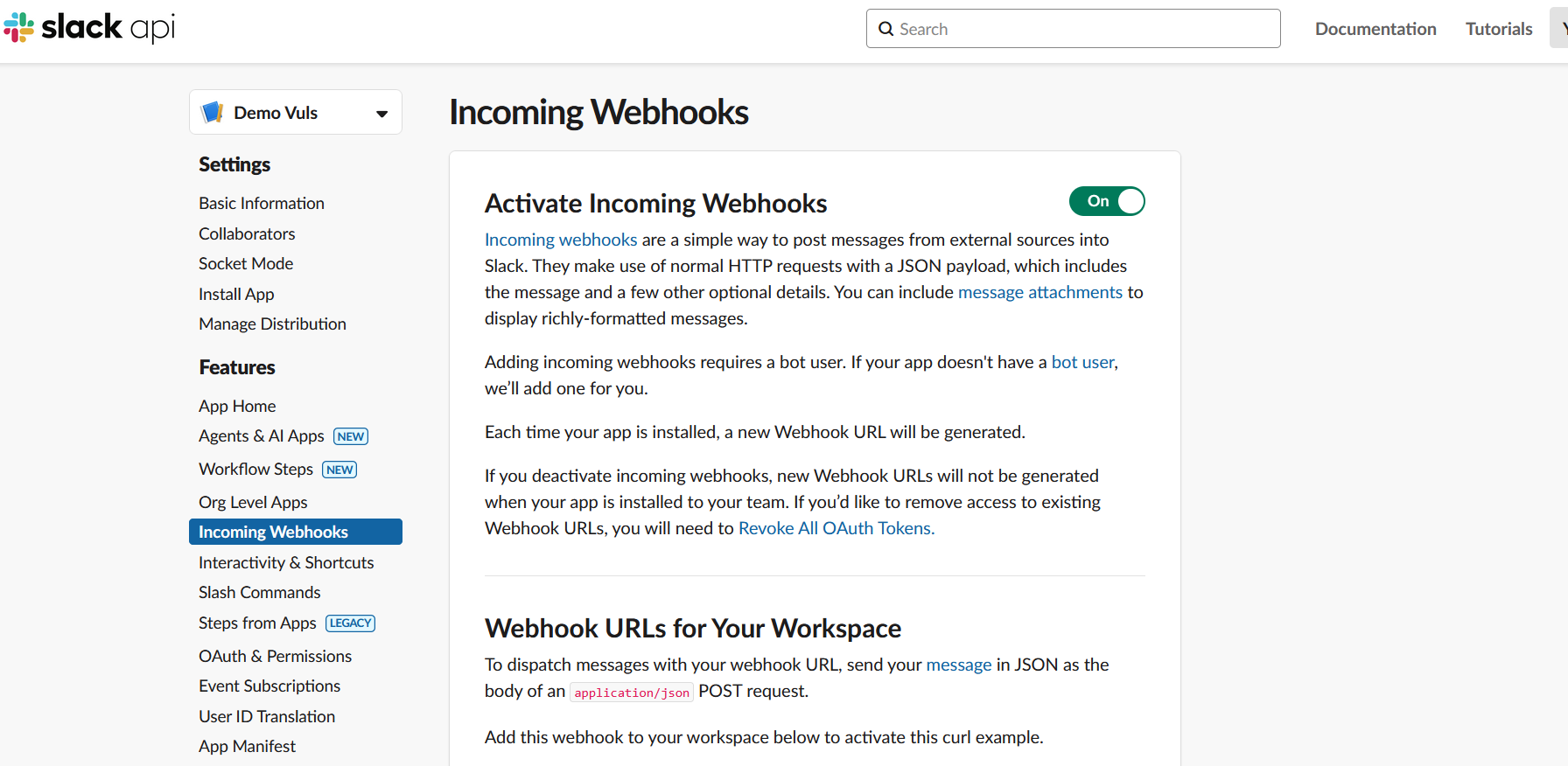 Once you created an app, now enable incoming webhook.