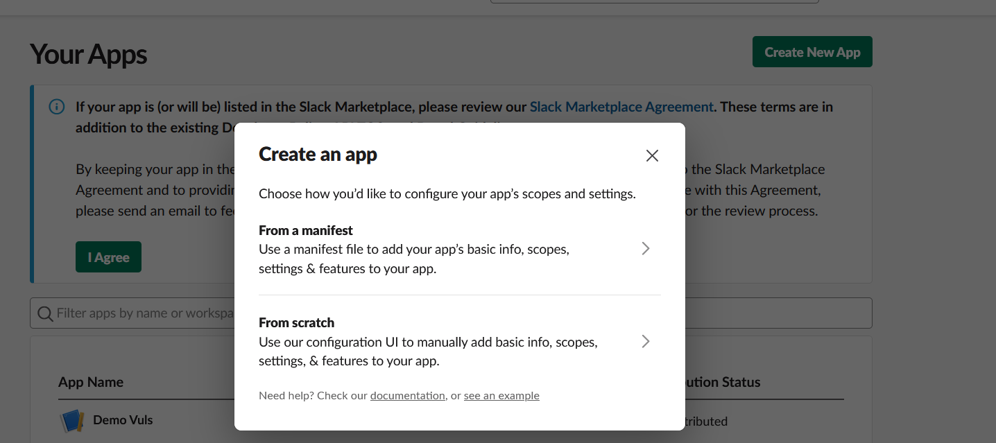 first you can access this link https://api.slack.com/apps?new_app=1 to create an app on slack, and make sure i have created a slack account.
