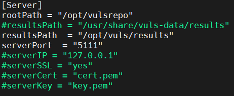 change the configuration of rootpath to /opt/vulsrepo and resultpath /opt/vuls/results in /opt/vulsrepo/servervulsrepo-config.toml, you can fill serverIP with your Public IP/Local IP